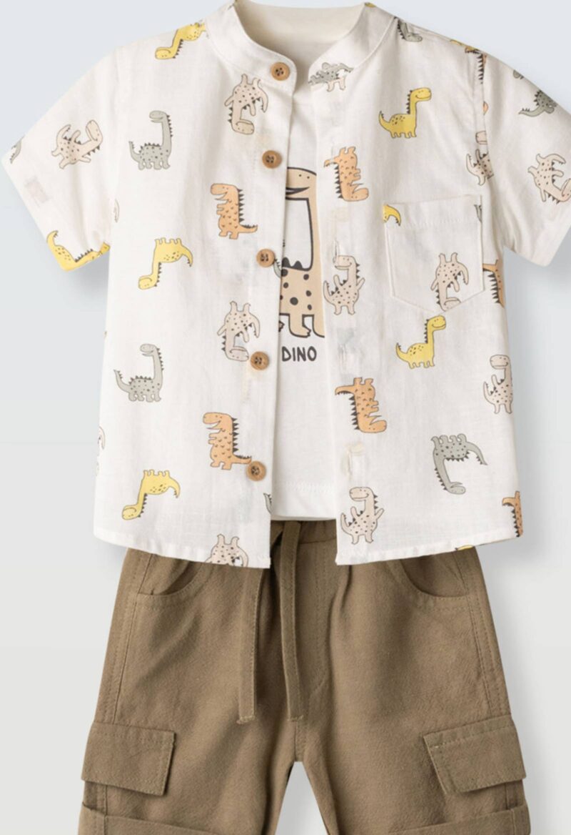 Σετ με μπεζ κοντό μανίκι πουκάμισο, άσπρη μπλούζα και καφέ βερμούδα με λάστιχο