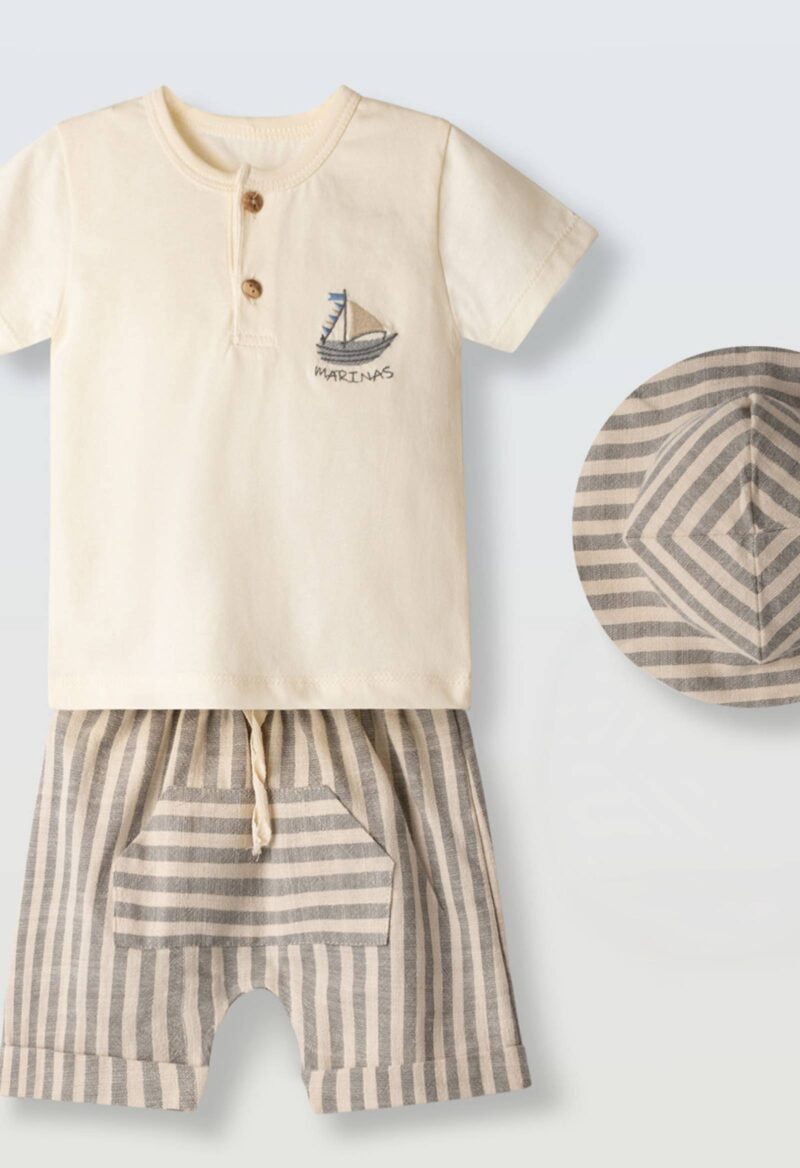 Σετ με μπεζ μπλούζα κόντο μανίκι, λινή βερμούδα και καπέλο