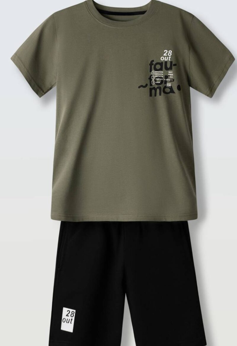 Σετ με χακί μπλούζα και μαύρη βερμούδα Σύνθεση 95% βαμβάκι& 5% ελαστάν Brand Hashtag Χρώμα Μαύρο, Χακί Φύλο Αγόρι Είδος Βερμούδες, Σετ, Σορτς Εποχή Άνοιξη, Καλοκαίρι Μέγεθος 6 χρονών, 8 χρονών, 10 χρονών, 12 χρονών, 14 χρονών, 16 χρονών Έτος 2026