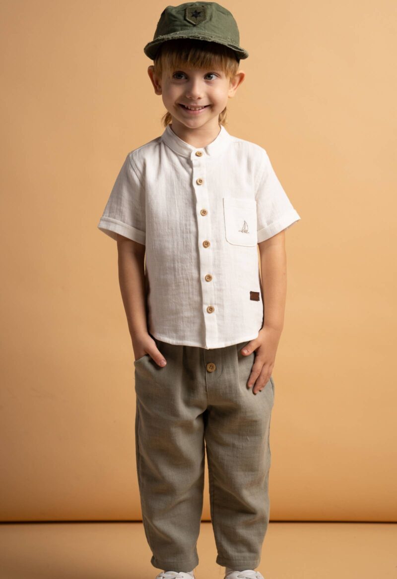 Σετ με άσπρο μάο κοντομάνικο λινό πουκάμισο και φυστικί λινό παντελόνι