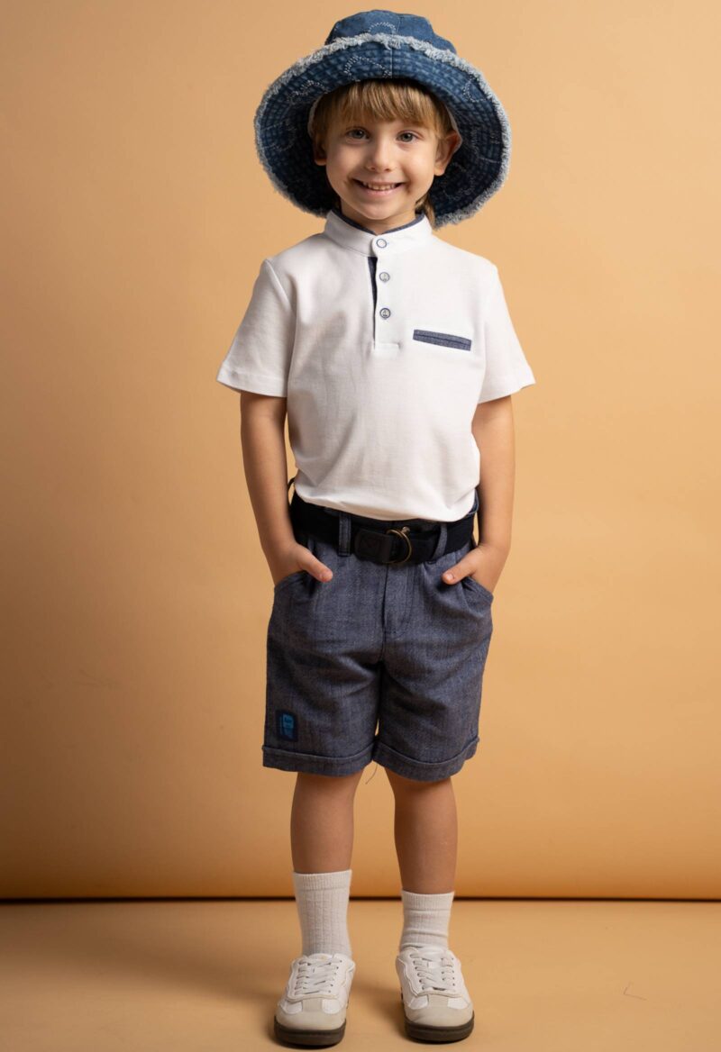 Σετ με άσπρη μάο μπλούζα και μπλέ βερμούδα με ζώνη Σύνθεση 100% βαμβάκι Brand Hashtag Χρώμα Άσπρο, Μπλε Φύλο Αγόρι Είδος Βερμούδες, Σετ, Σορτς Εποχή Άνοιξη, Καλοκαίρι Μέγεθος 2 χρονών, 3 χρονών, 4 χρονών, 5 χρονών, 6 χρονών Έτος 2026