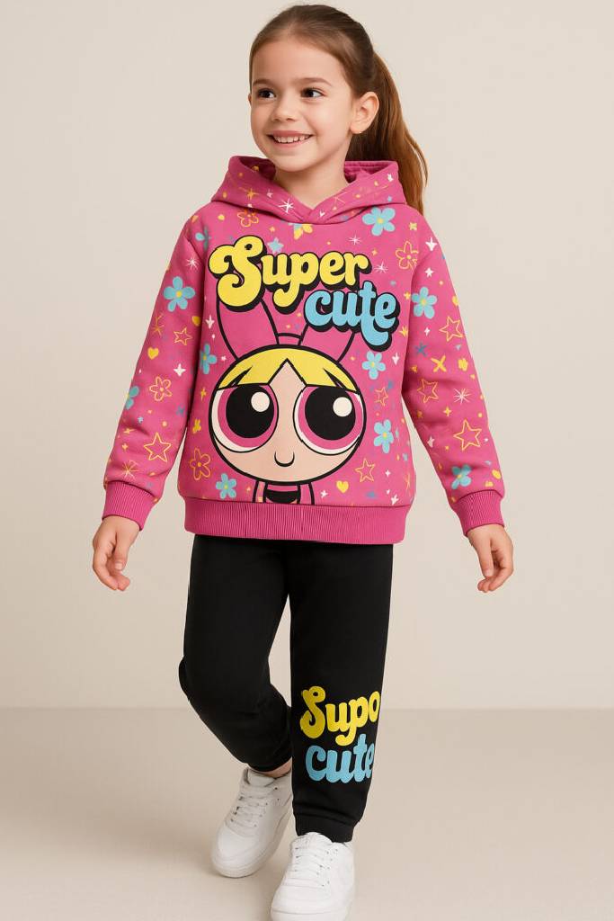 Σετ ροζ μπλούζα με κουκούλα και μαύρη φόρμα με χνούδι