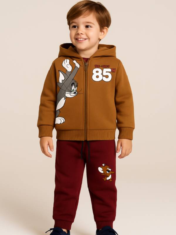 Σετ ζακέτα με κουκούλα σε χρώμα καφέ και μπορντό φόρμα με χνούδι